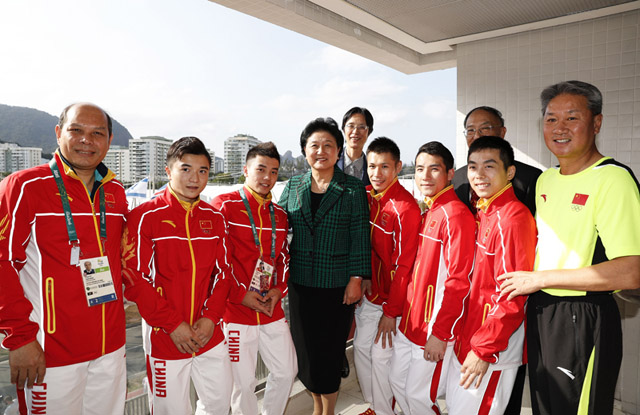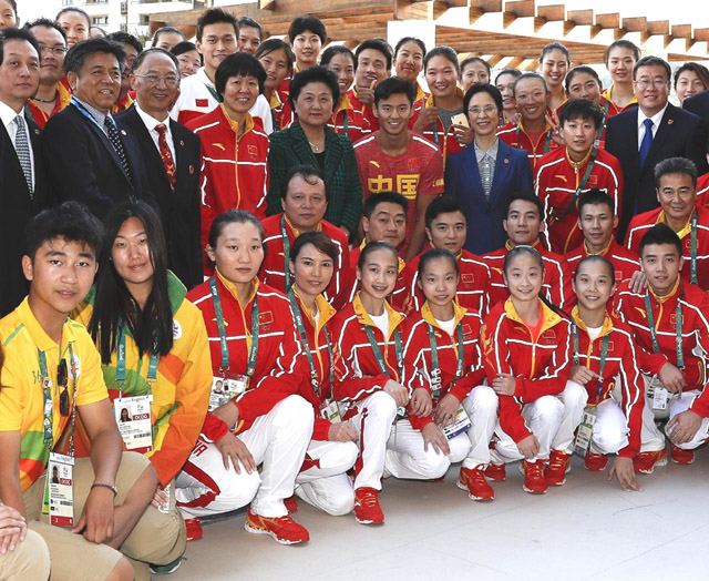 当地时间8月4日下午,国务院副总理刘延东作为习近平主席特别代表,在出席里约热内卢奥运会开幕式前夕专程到里约奥运村看望中国体育代表团。这是刘延东与中国体操队队员、教练等合影。新华社记者 韩岩 摄