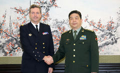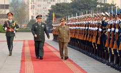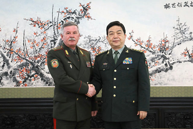 4月18日,国务委员兼国防部长常万全在北京八一大楼会见来访的白俄罗斯边防委员会主席拉波。新华社记者 刘芳 摄