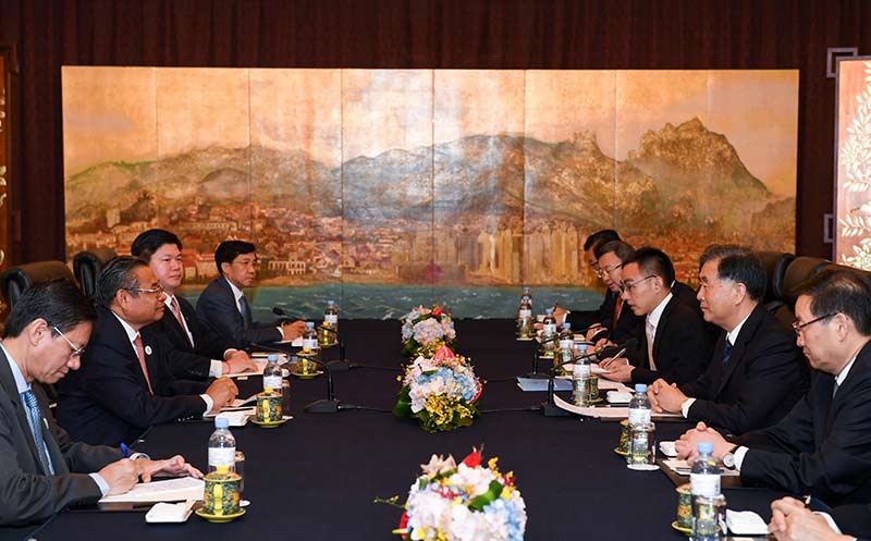 6月19日,国务院副总理汪洋在青岛会见前来出席亚欧数字互联互通高级别论坛的柬埔寨副首相因蔡利。新华社记者 陈晔华 摄