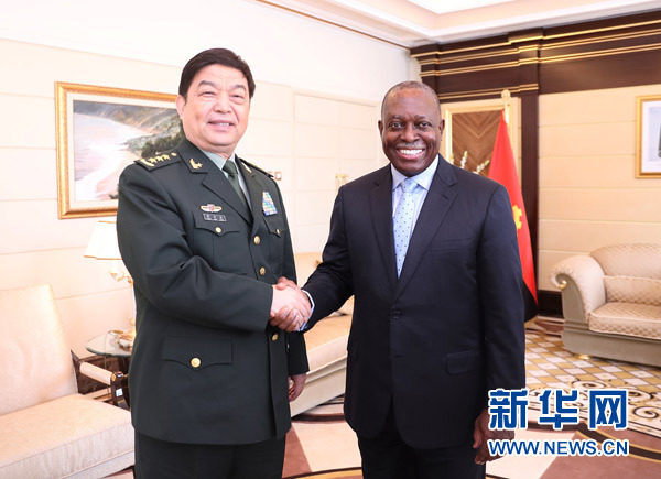 7月13日,安哥拉副总统维森特(右)在罗安达会见正在安哥拉访问的中国国务委员兼国防部长常万全。新华社发(李晓伟 摄)