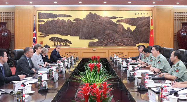 7月20日,国务委员兼国防部长常万全在北京八一大楼会见英国首相国家安全顾问塞德维尔。新华社发(李刚 摄)
