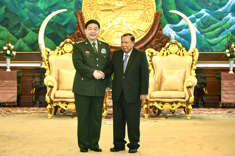9月14日,老挝人民革命党总书记、国家主席本扬在万象会见来访的中国国务委员兼国防部长常万全。新华社记者 李芒茫 摄