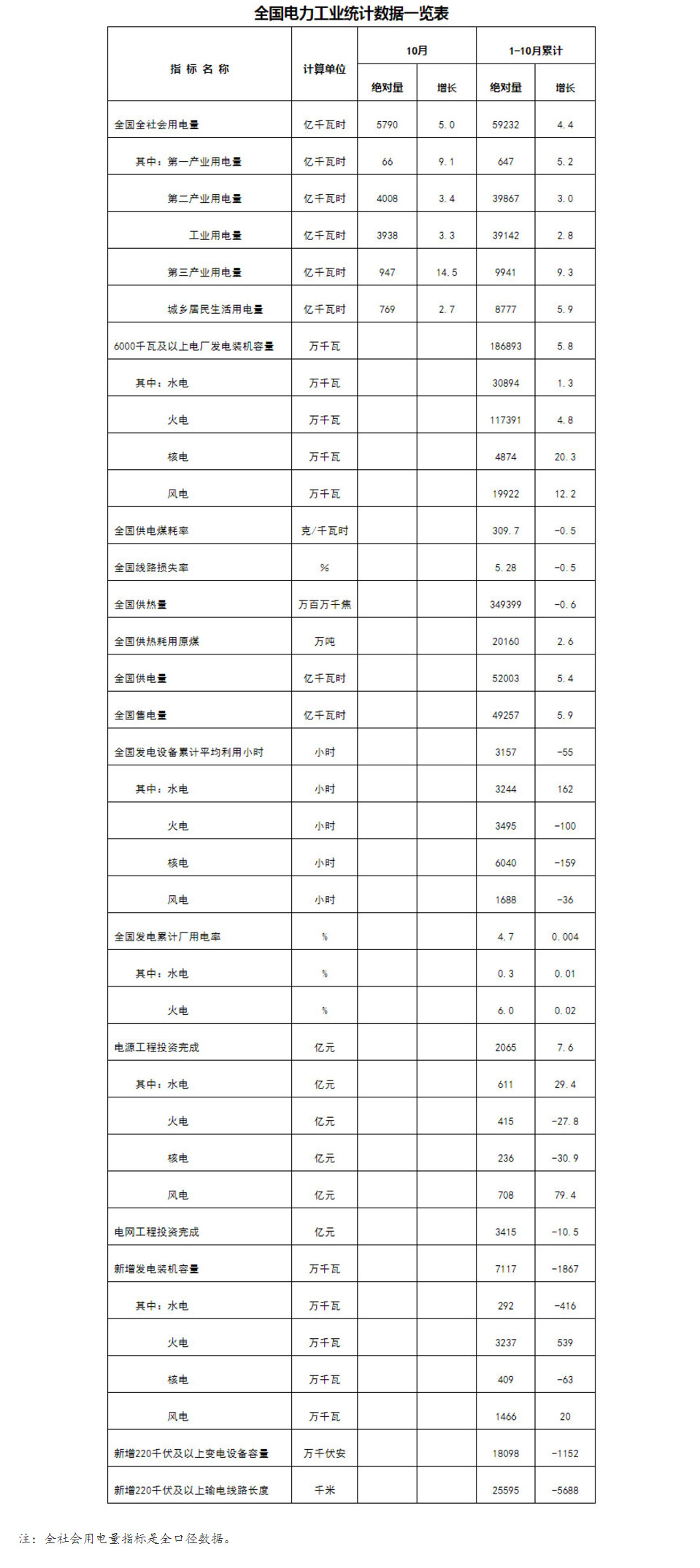 国家能源局发布1-10月份全国电力工业统计数据