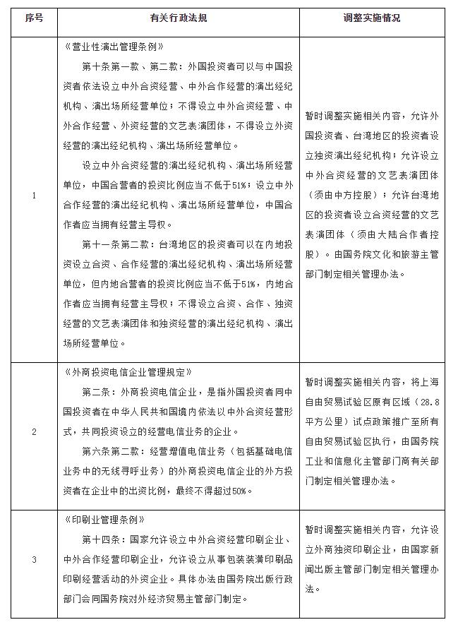 为保障自由贸易试验区有关改革开放措施依法顺利实施,国务院决定,在自由贸易试验区暂时调整实施《营业性演出管理条例》、《外商投资电信企业管理规定》和《印刷业管理条例》3部行政法规的有关规定(目录附后)。