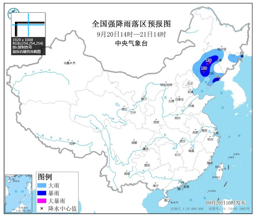 预计,9月20日14时至21日14时,内蒙古东南部、辽宁大部、吉林中西部和东北部等地部分地区有大到暴雨,其中,内蒙古东南部、辽宁西部等地局地有大暴雨(100~120毫米),上述地区小时降水量一般在15毫米以下,局地可达20~40毫米。