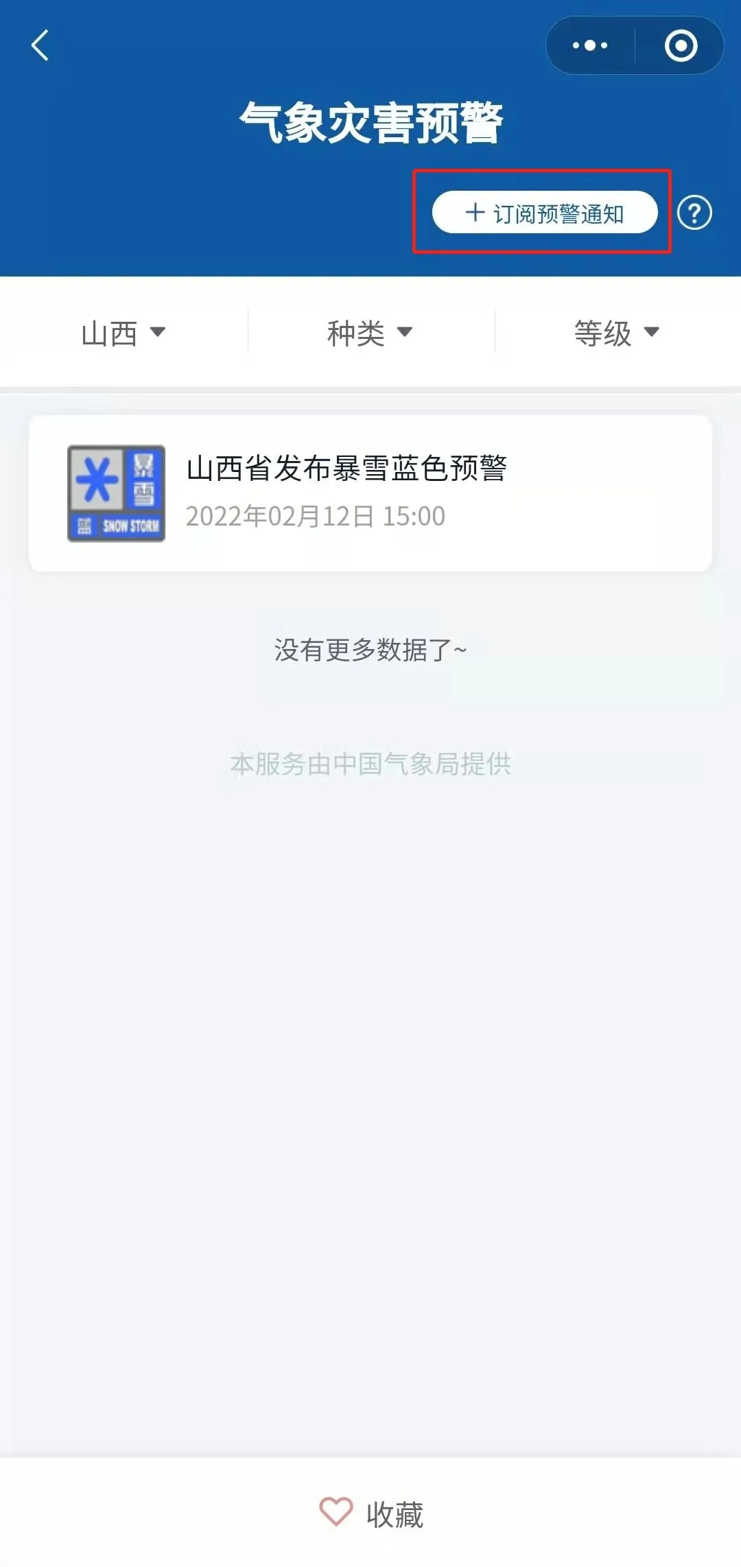 点击右上角的“订阅预警通知”按钮,我们就会为你推送最近一次定位的气象灾害预警提醒。