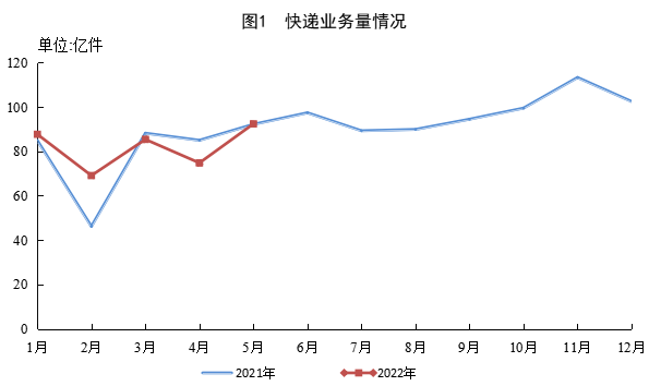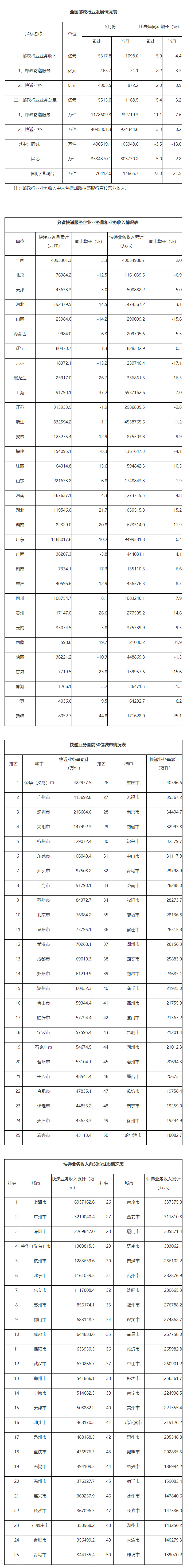 5月份,全国快递服务企业业务量完成92.4亿件,同比增长0.2%;业务收入完成872.2亿元,同比增长0.9%。