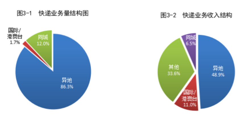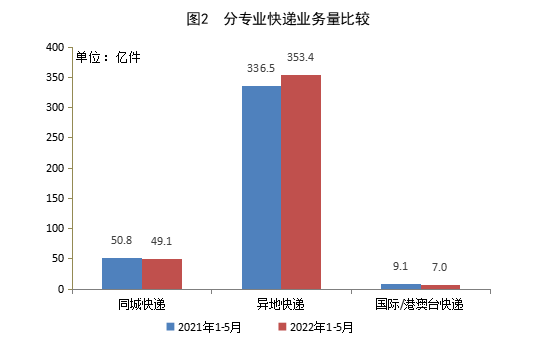 1-5月,同城、异地、国际/港澳台快递业务量分别占全部快递业务量的12.0%、86.3%和1.7%;业务收入分别占全部快递业务收入的6.5%、48.9%和11.0%。与去年同期相比,同城快递业务量的比重下降0.8个百分点,异地快递业务量的比重上升1.4个百分点,国际/港澳台业务量的比重下降0.6个百分点。