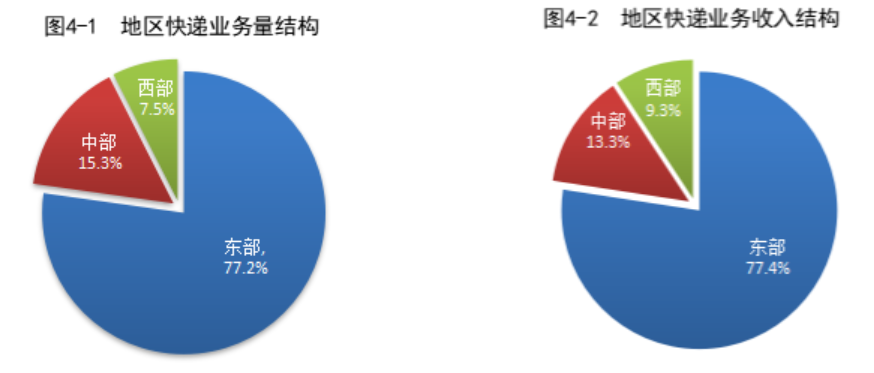 1-5月,东、中、西部地区快递业务量比重分别为77.2%、15.3%和7.5%,业务收入比重分别为77.4%、13.3%和9.3%。与去年同期相比,东部地区快递业务量比重下降1.3个百分点,快递业务收入比重下降1.1个百分点;中部地区快递业务量比重上升1.1个百分点,快递业务收入比重上升0.6个百分点;西部地区快递业务量比重上升0.2个百分点,快递业务收入比重上升0.5个百分点。