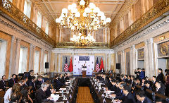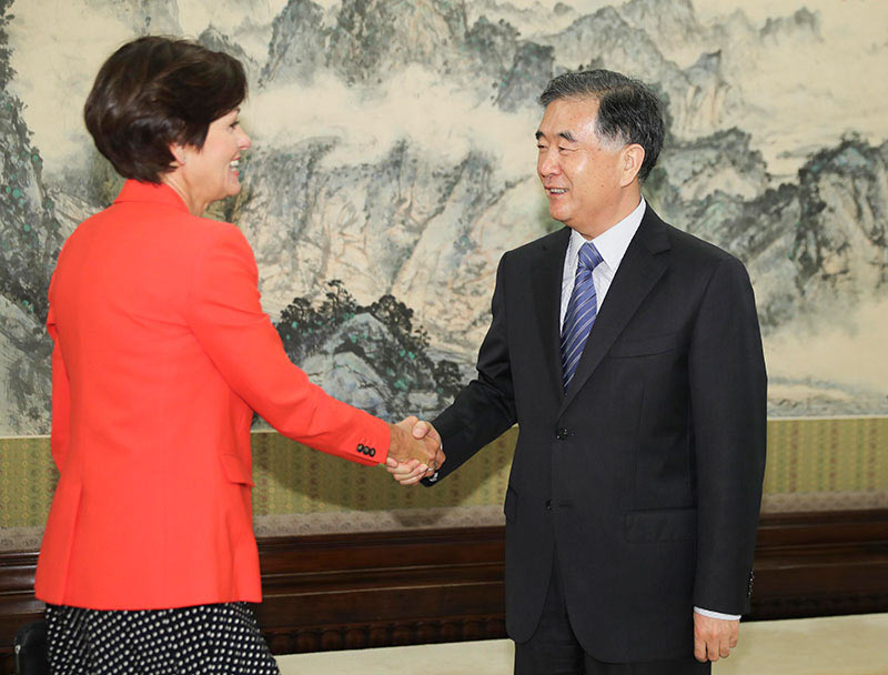 7月25日,国务院副总理汪洋在北京中南海紫光阁会见美国艾奥瓦州州长金·雷诺兹一行。新华社记者 丁林 摄