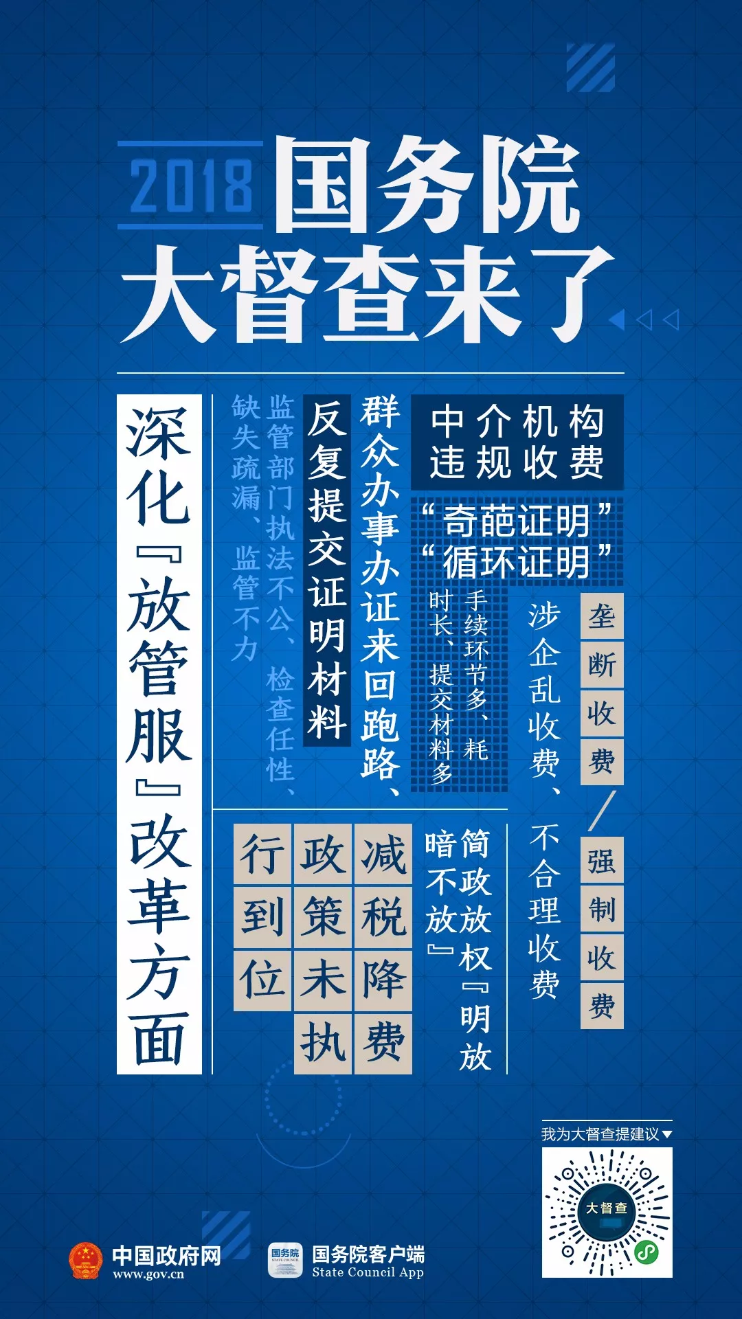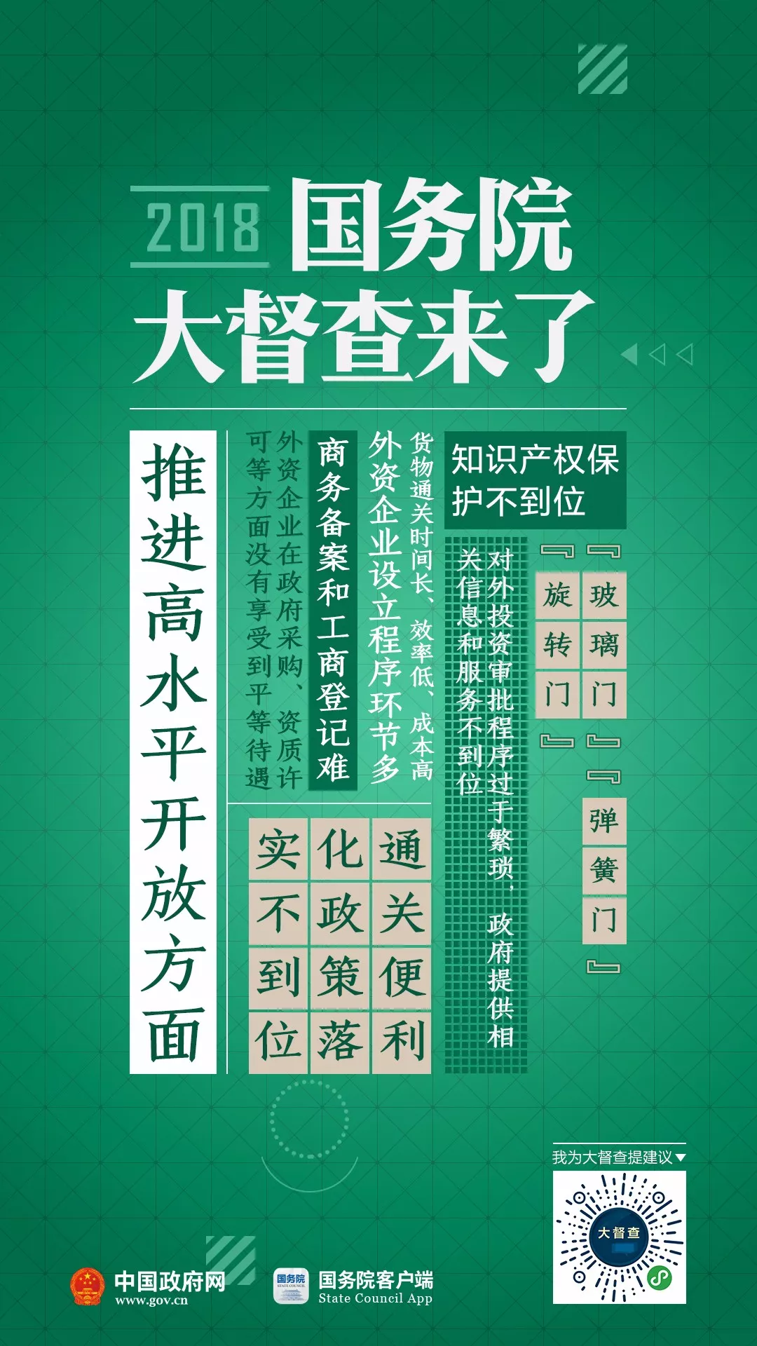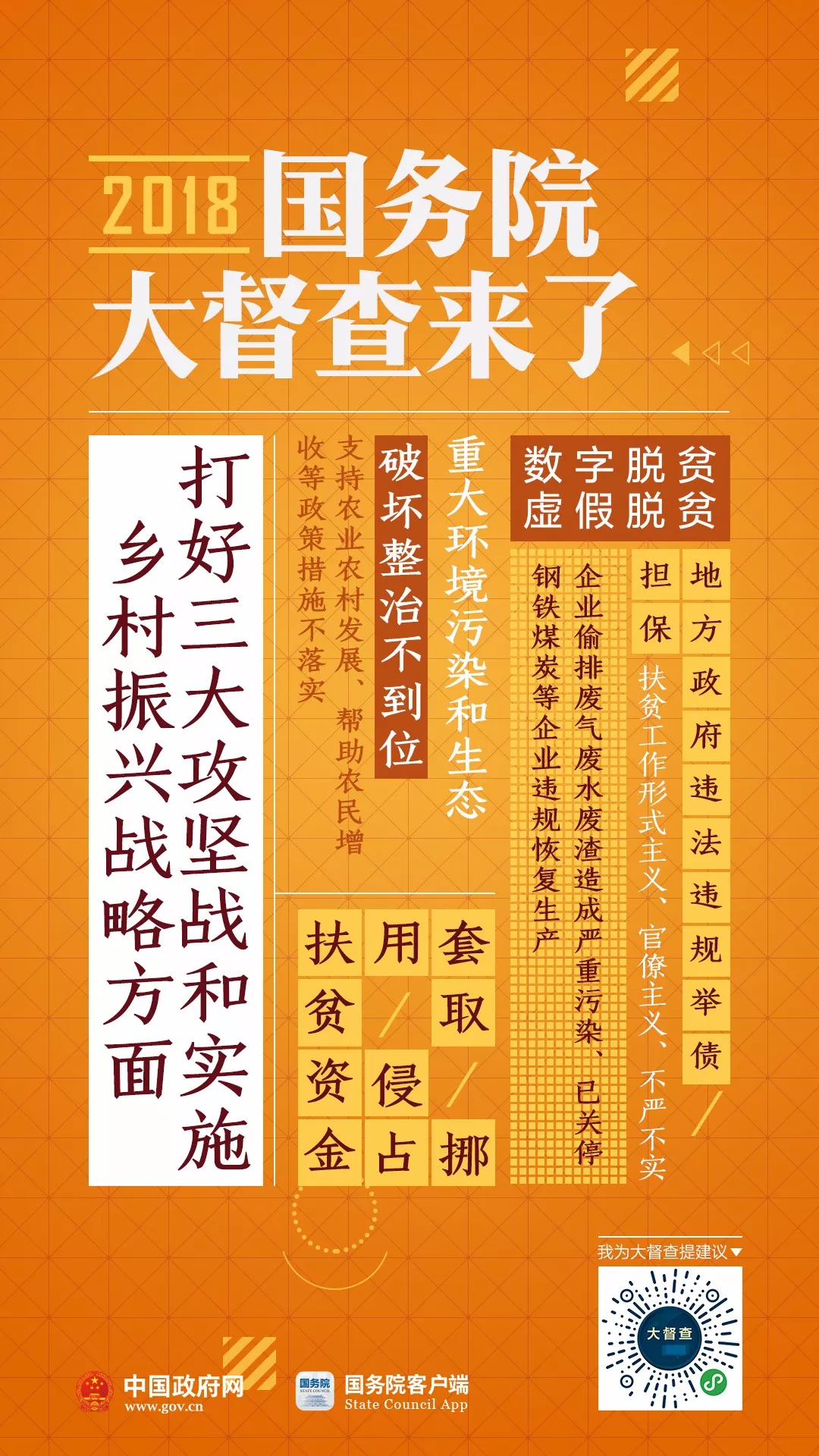 2018年国务院大督查启动了!从7月初至8月初,各地区、各部门开展全面自查。8月下旬开始,国务院将派出督查组,对31个省(区、市)、新疆生产建设兵团和30个国务院部门、单位开展实地督查。为配合此次国务院大督查,7月10日至9月10日,国务院办公厅开展“我为大督查提建议”活动。国办督查室将对群众反映的问题线索和意见建议进行汇总整理,视情转有关地方、部门和国务院督查组参考和处理。 国务院督查组将到你家乡,有问题线索、意见建议,统统扫码说↓↓
