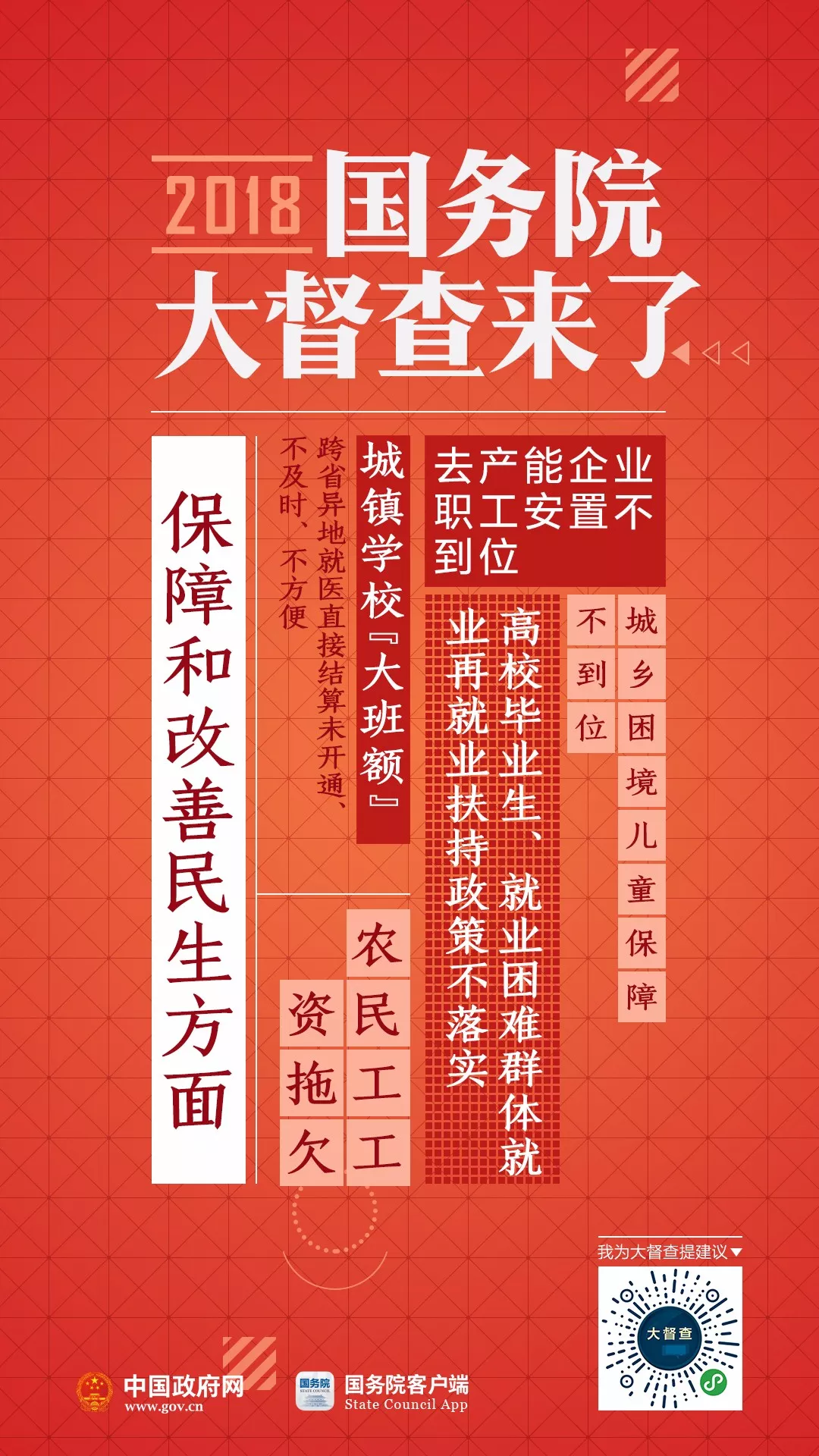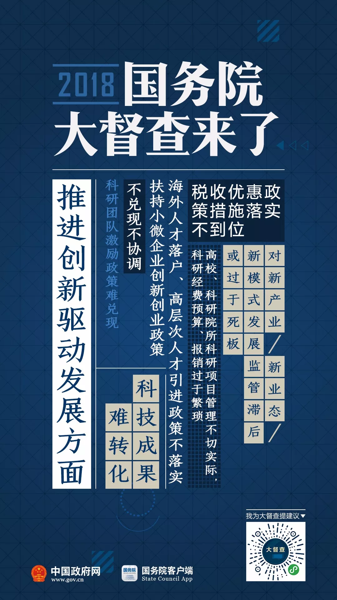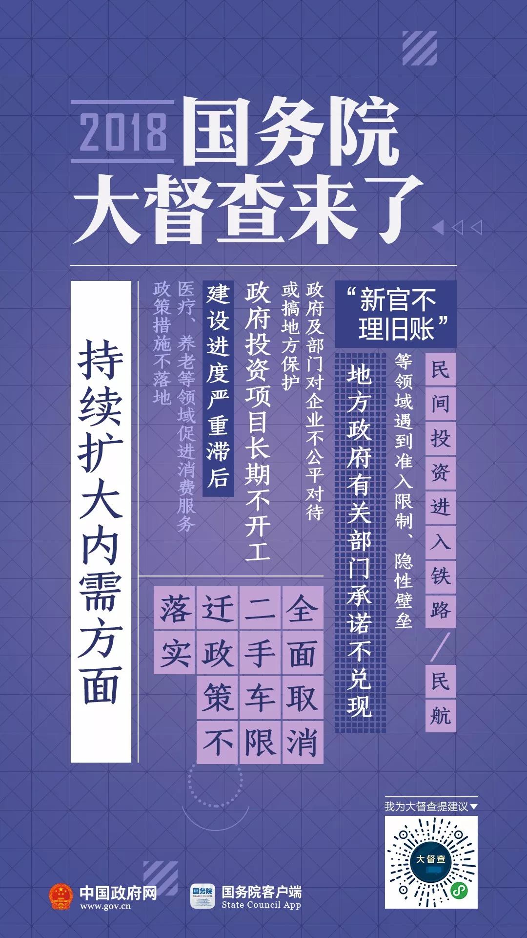 2018年国务院大督查启动了!从7月初至8月初,各地区、各部门开展全面自查。8月下旬开始,国务院将派出督查组,对31个省(区、市)、新疆生产建设兵团和30个国务院部门、单位开展实地督查。为配合此次国务院大督查,7月10日至9月10日,国务院办公厅开展“我为大督查提建议”活动。国办督查室将对群众反映的问题线索和意见建议进行汇总整理,视情转有关地方、部门和国务院督查组参考和处理。 国务院督查组将到你家乡,有问题线索、意见建议,统统扫码说↓↓