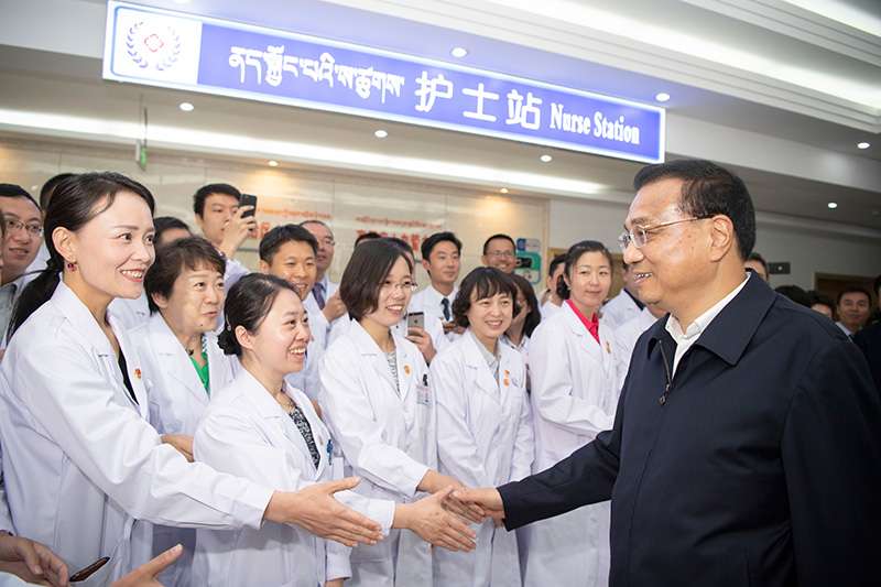 在西藏人民医院,李克强与患者、医生护士交流。他说,目前西藏医疗资源难以满足群众需要,国家将在医院、藏医药大学建设上加大支持。他勉励在医院工作的援藏人员继续服务好西藏群众,带出更多当地需要的医务人员。