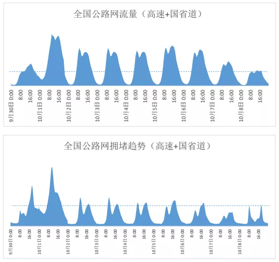 预计假期前一天(9月30日)下午15点到20点流量和拥堵均高于工作日水平。假期第一天(10月1日)10时至12时是出程高峰时段,预计流量和拥堵程度达到整个国庆假期最高峰。