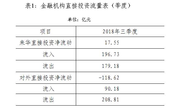 2018年三季度,境外投资者对我国境内金融机构直接投资流入196.73亿元,流出179.18亿元,净流入17.55亿元;我国境内金融机构对境外直接投资流出208.81亿元,流入90.18亿元,净流出118.62亿元(见表1)。
