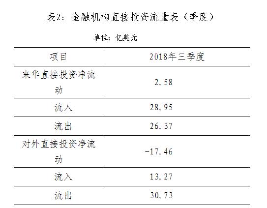 按美元计值,2018年三季度,境外投资者对我国境内金融机构直接投资流入28.95亿美元,流出26.37亿美元,净流入2.58亿美元;我国境内金融机构对境外直接投资流出30.73亿美元,流入13.27亿美元,净流出17.46亿美元(见表2)。
