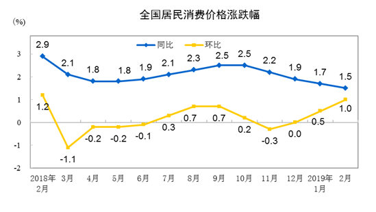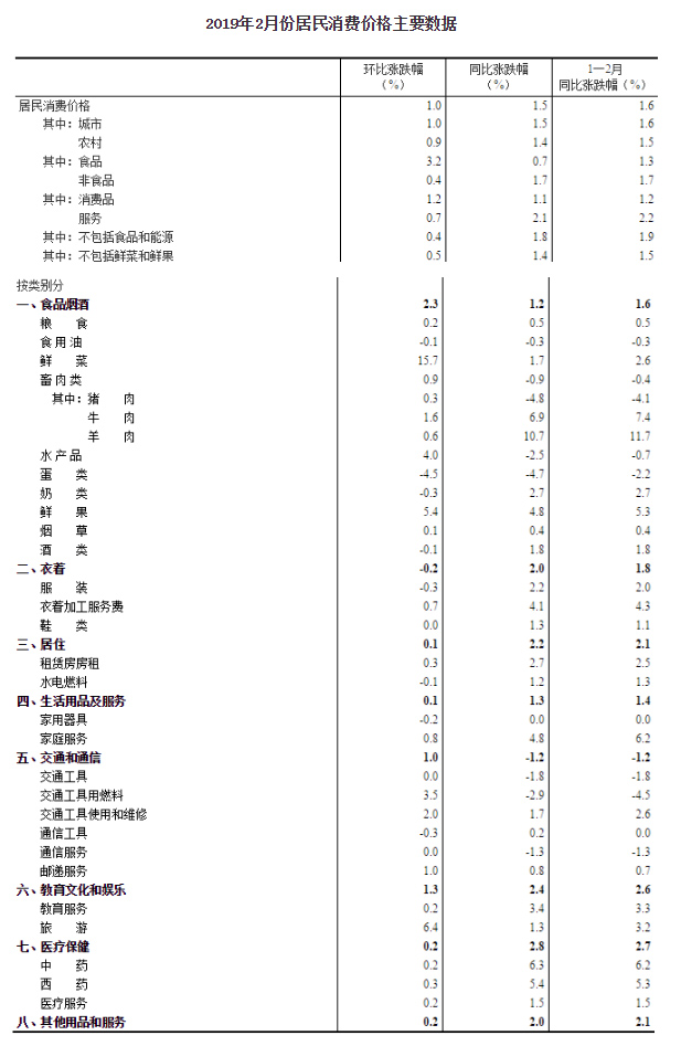 2019年2月份,全国居民消费价格同比上涨1.5%。其中,城市上涨1.5%,农村上涨1.4%;食品价格上涨0.7%,非食品价格上涨1.7%;消费品价格上涨1.1%,服务价格上涨2.1%。