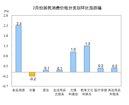 2月份,全国居民消费价格环比上涨1.0%。其中,城市上涨1.0%,农村上涨0.9%;食品价格上涨3.2%,非食品价格上涨0.4%;消费品价格上涨1.2%,服务价格上涨0.7%。