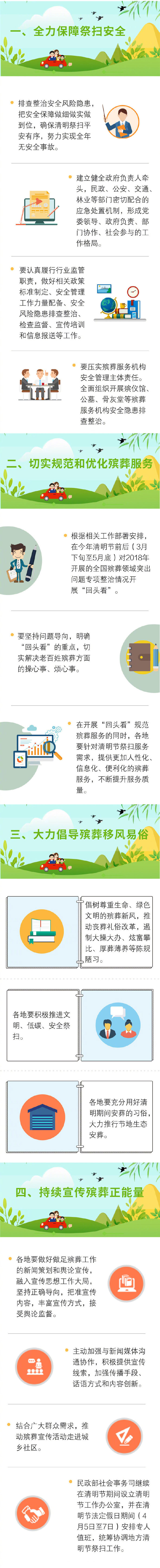 近日,民政部印发《关于做好2019年清明节祭扫工作的通知》,要求切实加强2019年清明节期间群众祭扫服务保障,推进殡葬领域防风险、保安全、惠民生、树新风、聚共识等工作,努力营造平安、温暖、文明、和谐的节日祭扫氛围。