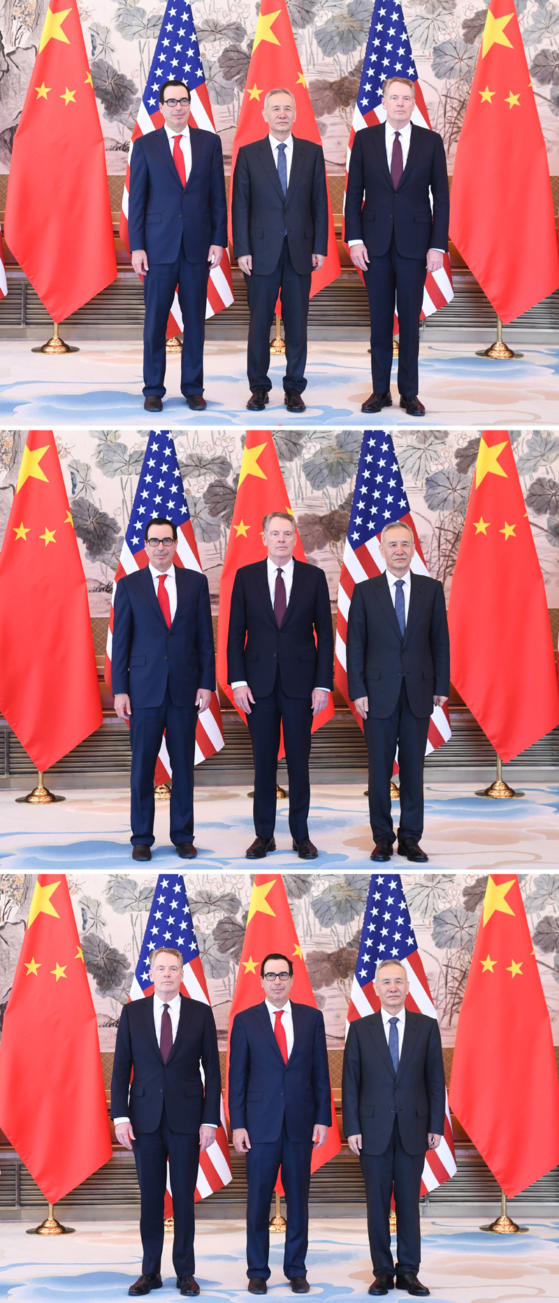 4月30日至5月1日,中共中央政治局委员、国务院副总理、中美全面经济对话中方牵头人刘鹤与美国贸易代表莱特希泽、财政部长姆努钦在北京举行第十轮中美经贸高级别磋商(拼版照片)。新华社记者申宏、翟健岚 摄