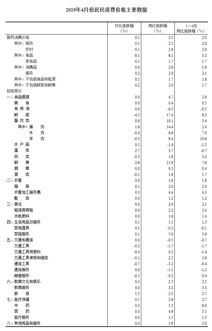 2019年4月份,全国居民消费价格同比上涨2.5%。其中,城市上涨2.5%,农村上涨2.6%;食品价格上涨6.1%,非食品价格上涨1.7%;消费品价格上涨2.9%,服务价格上涨2.0%。