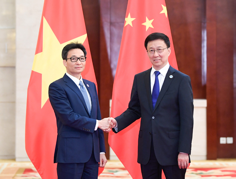 9月20日,中共中央政治局常委、国务院副总理韩正在广西南宁会见出席第十六届中国—东盟博览会和中国—东盟商务与投资峰会的越南副总理武德担。新华社记者 申宏 摄