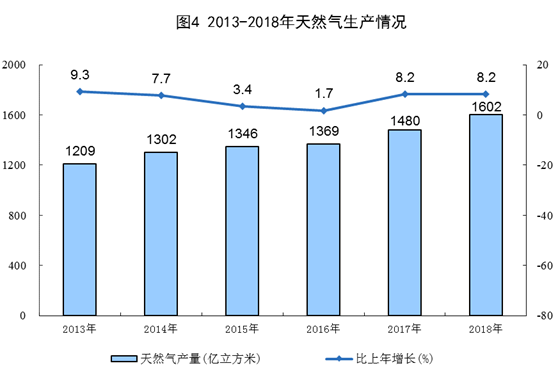 天然气连续两年增产超百亿立方米。2018年,天然气产量1602亿立方米,比上年增产122亿立方米,常规天然气和非常规天然气分别增产94亿立方米和28亿立方米。与2013年比,天然气产量增长37.5%,年均增长6.6%。