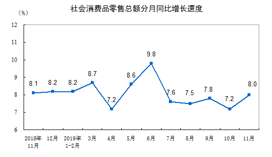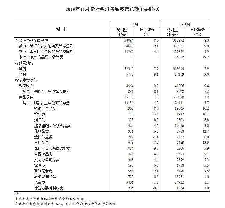 2019年1-11月份,社会消费品零售总额372872亿元,同比增长8.0%。其中,除汽车以外的消费品零售额337951亿元,增长9.0%。