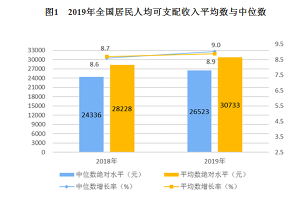 2019年,全国居民人均可支配收入中位数26523元,增长9.0%,中位数是平均数的86.3%。其中,城镇居民人均可支配收入中位数39244元,增长7.8%,是平均数的92.6%;农村居民人均可支配收入中位数14389元,增长10.1%,是平均数的89.8%。