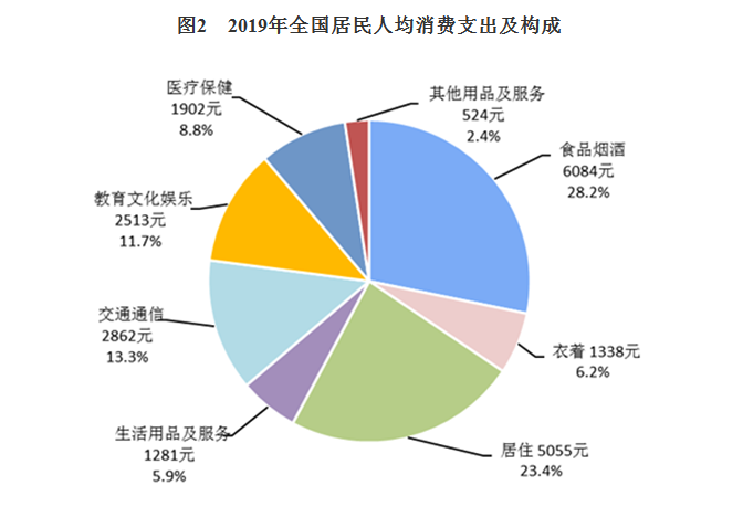 2019年,全国居民人均食品烟酒消费支出6084元,增长8.0%,占人均消费支出的比重为28.2%;人均衣着消费支出1338元,增长3.8%,占人均消费支出的比重为6.2%;人均居住消费支出5055元,增长8.8%,占人均消费支出的比重为23.4%;人均生活用品及服务消费支出1281元,增长4.8%,占人均消费支出的比重为5.9%;人均交通通信消费支出2862元,增长7.0%,占人均消费支出的比重为13.3%;人均教育文化娱乐消费支出2513元,增长12.9%,占人均消费支出的比重为11.7%;人均医疗保健消费支出1902元,增长12.9%,占人均消费支出的比重为8.8%;人均其他用品及服务消费支出524元,增长9.7%,占人均消费支出的比重为2.4%。