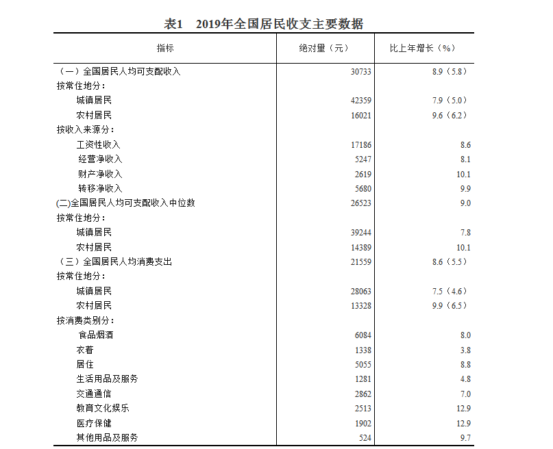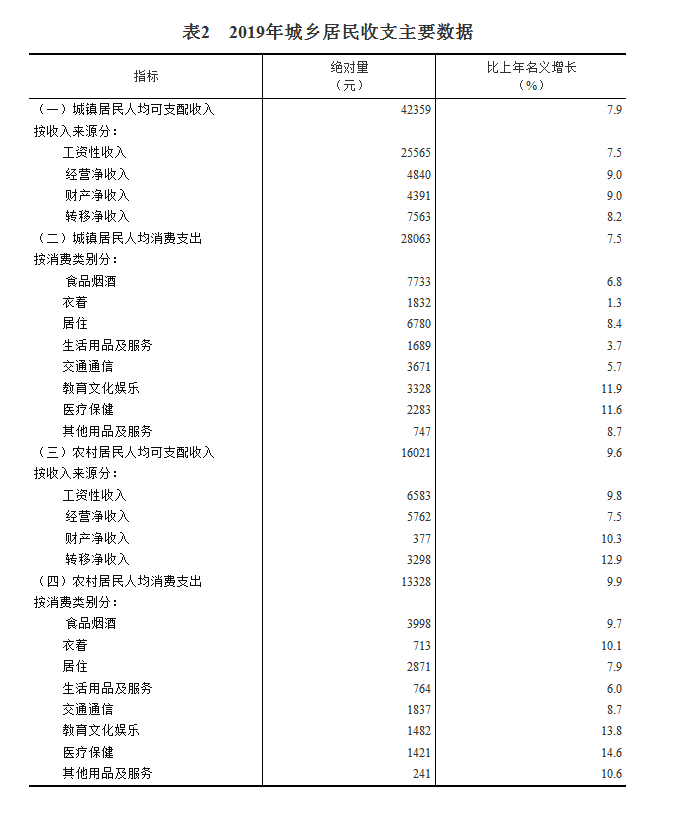 2019年,全国居民人均可支配收入30733元,比上年名义增长8.9%,扣除价格因素,实际增长5.8%。其中,城镇居民人均可支配收入42359元,增长(以下如无特别说明,均为同比名义增长)7.9%,扣除价格因素,实际增长5.0%;农村居民人均可支配收入16021元,增长9.6%,扣除价格因素,实际增长6.2%。