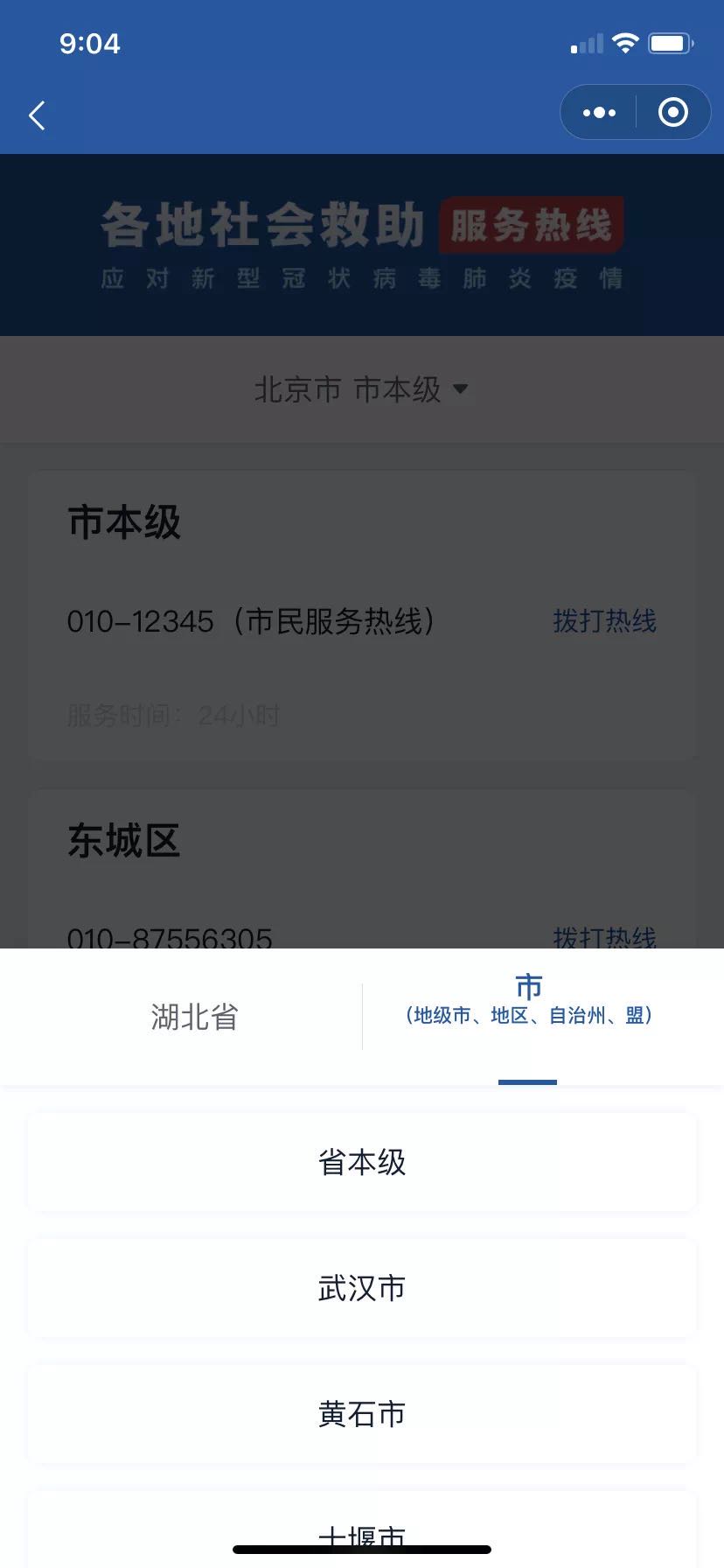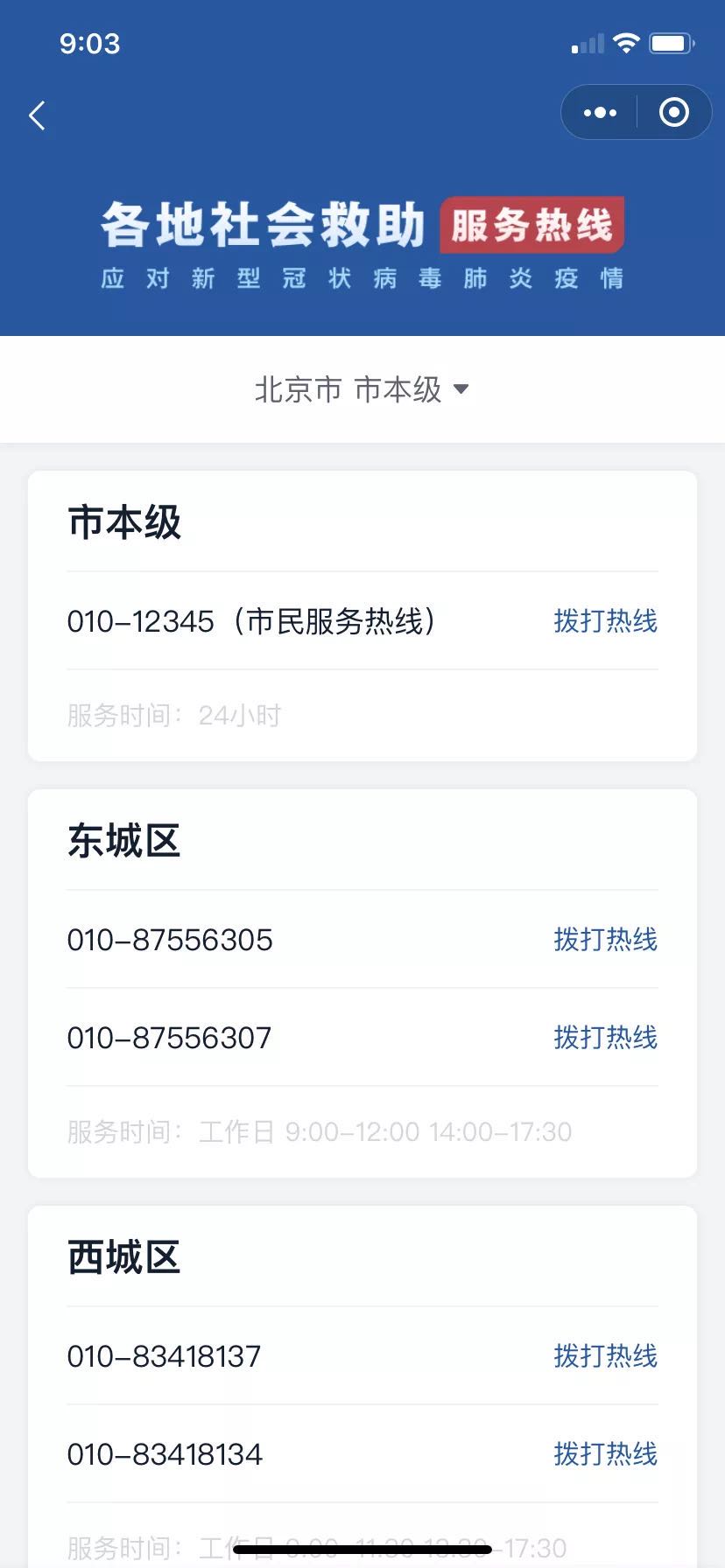 选择省份后可以看到省级热线,继续选定城市后可看到市级到区级的热线,点击拨打热线,就可以直接连线通话。