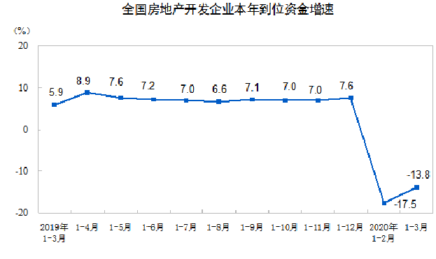 1—3月份,房地产开发企业到位资金33566亿元,同比下降13.8%,降幅比1—2月份收窄3.7个百分点。其中,国内贷款6716亿元,下降5.9%;利用外资19亿元,下降42.5%;自筹资金10755亿元,下降8.8%;定金及预收款9542亿元,下降22.4%;个人按揭贷款5228亿元,下降7.4%。