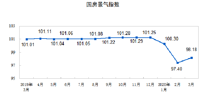 3月份,房地产开发景气指数(简称“国房景气指数”)为98.18,比2月份提高0.78点。