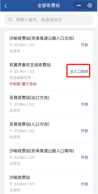 进入小程序,可自动获取你的当前位置,帮你查看最近的收费站开放状态。