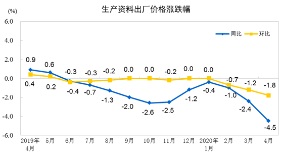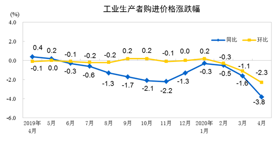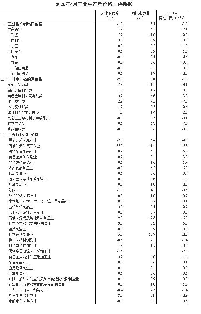 2020年4月份,全国工业生产者出厂价格同比下降3.1%,环比下降1.3%;工业生产者购进价格同比下降3.8%,环比下降2.3%。1—4月平均,工业生产者出厂价格比去年同期下降1.2%,工业生产者购进价格下降1.5%。