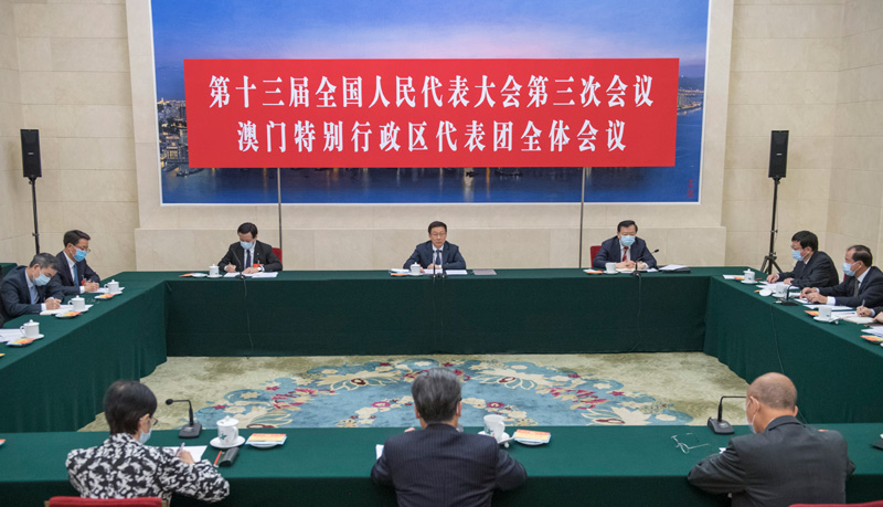 5月24日,中共中央政治局常委、国务院副总理韩正参加十三届全国人大三次会议澳门代表团的审议。新华社记者 高洁 摄