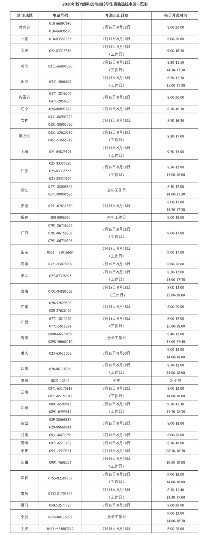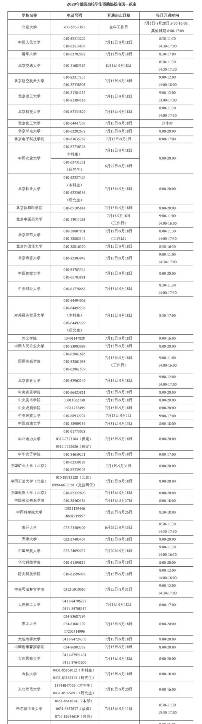 今年是教育部开通热线电话的第16年,受新冠肺炎疫情影响,全社会对学生资助给予了更多的关注。为了更好地服务家庭经济困难学生及家长,解除他们的后顾之忧,2020年,教育部将高校学生资助热线电话受理时间又延长了一周,具体受理时间为7月15日—9月18日(含周六日)早8:00—晚20:00,是历年来开通时间最长的一年。教育部同时要求各省(自治区、直辖市、计划单列市)教育行政部门、各中央高校及地方高校全面开通2020年高校学生资助热线电话。