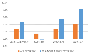 另一方面,高技术行业用电量强劲反弹,继续引领工业高质量发展。二季度,高技术及装备制造业用电量同比增长4.6%,超出工业用电量增速约2个百分点。其中,对比4月来看,5月和6月高技术行业用电量同比增速分别快速反弹至5.4%和8.4%,大幅高出工业用电量增速9.3个百分点和10.8个百分点。由此可见,作为“中国制造”的一股中坚力量,高技术行业已摆脱前期疫情带来的困境,重新回到快速发展轨道上来,未来必将继续引领我国工业高质量发展。