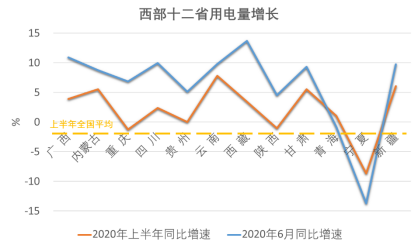 西部地区用电量增长引领全国,表明全面建成小康社会将圆满完成。上半年,西部十二省份用电量合计同比增长2.9%,高出全国平均4.2个百分点。其中,云南、新疆、甘肃、内蒙等四省用电量增速较高,均超过5%。尤其二季度以来,西部地区用电量加速反弹态势更加显著,4月、5月、6月分别增长4.2%、5.9%和7.0%。其中,6月,西藏、广西、四川、新疆、云南、甘肃等六省用电量增长均超过或接近10%;甘肃、重庆、陕西、新疆、青海、广西等六省增速都高于去年同期。上半年西部地区用电量的快速增长,体现出西部各省份经济活动和社会发展的强大动力。在新时代推进西部大开发形成新格局战略的指引下,2020年西部地区必将与全国一道全面建成小康社会,步入高质量发展快车道。