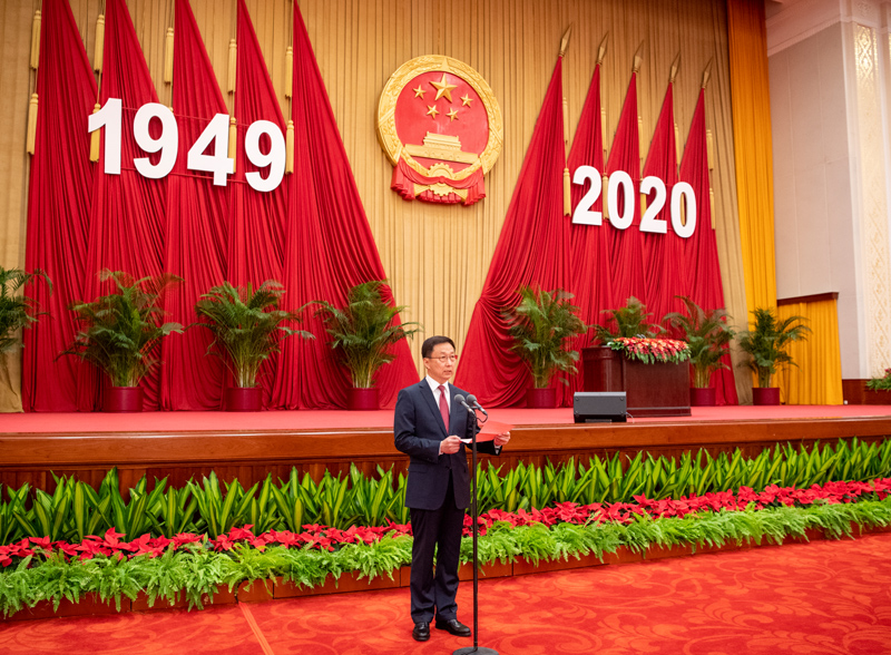 国务院在京举行国庆招待会 韩正主持 新华社 2020-09-30 9月30日晚,国务院在北京人民大会堂举行国庆招待会,热烈庆祝中华人民共和国成立七十一周年。中共中央政治局常委、国务院副总理韩正主持招待会。新华社记者 李学仁 摄