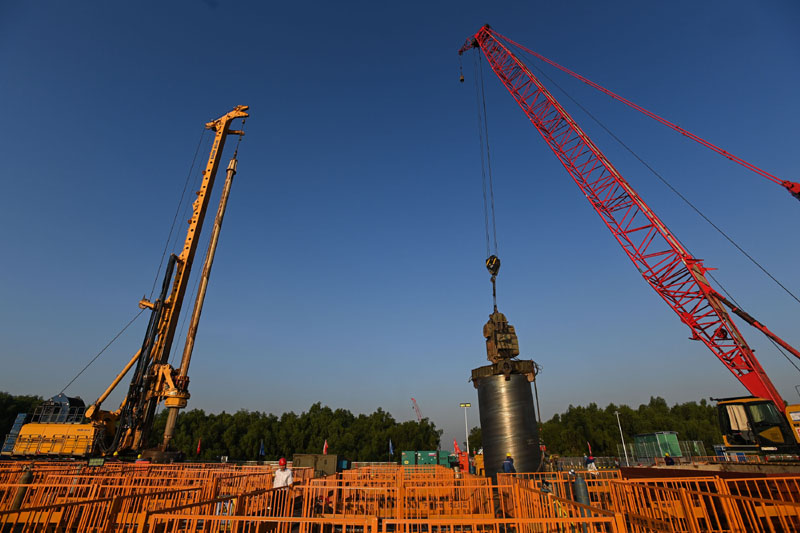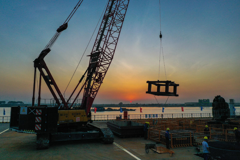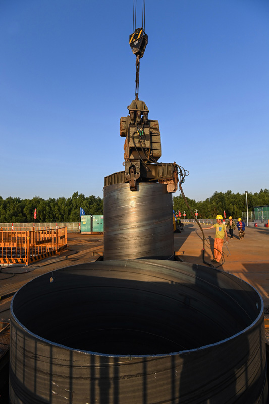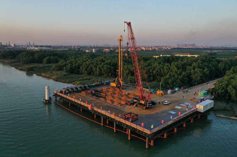 10月26日,施工人员在位于广州南沙区的南中高速洪奇门特大桥东塔平台吊装钢护筒。新华社记者 刘大伟 摄