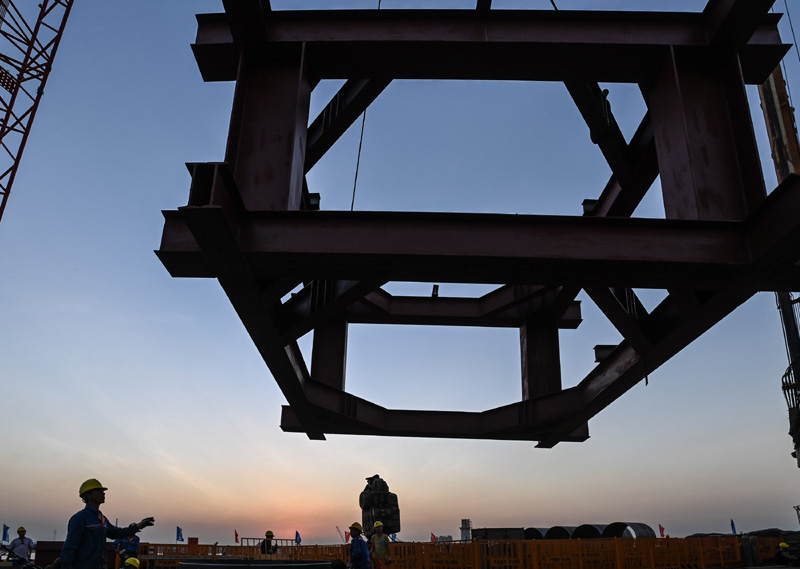 10月26日,施工人员在位于广州南沙区的南中高速洪奇门特大桥东塔平台吊装钢护筒导向架。新华社记者 刘大伟 摄