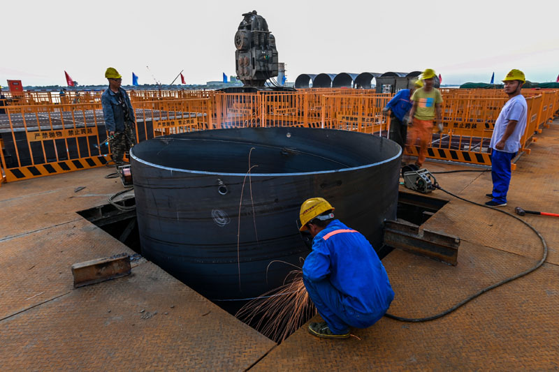10月26日,施工人员在位于广州南沙区的南中高速洪奇门特大桥东塔平台焊接钢护筒。新华社记者 刘大伟 摄