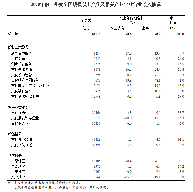 2020年前三季度全国规模以上文化及相关产业企业营业收入下降0.6% 降幅比上半年收窄5.6个百分点
