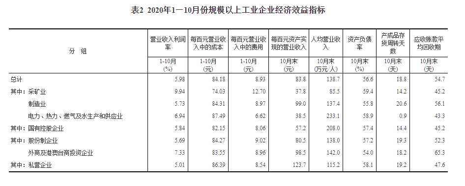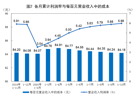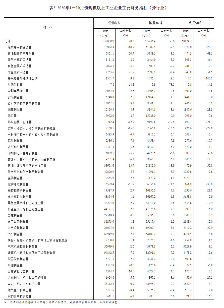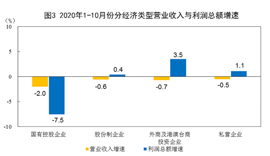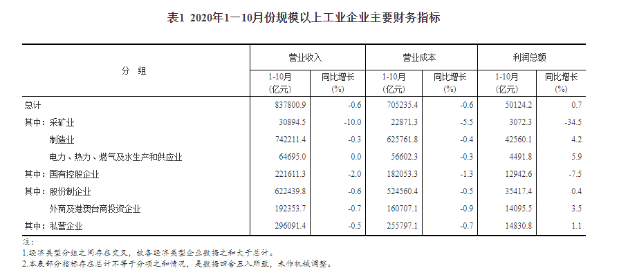 2020年1—10月份全国规模以上工业企业利润增长0.7%