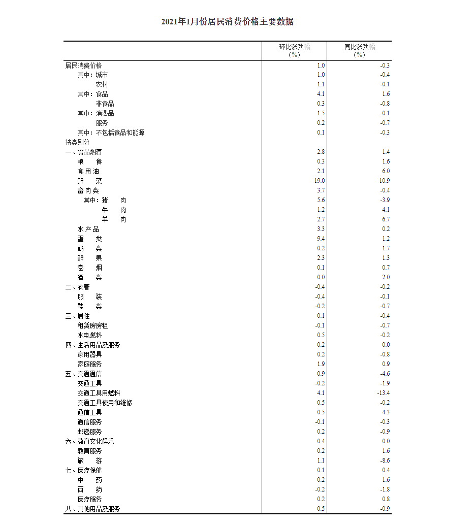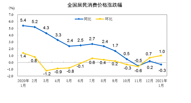2021年1月份居民消费价格同比下降0.3% 环比上涨1%