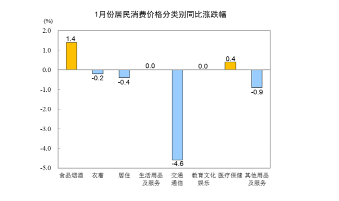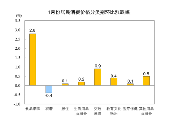 1月份,食品烟酒类价格同比上涨1.4%,影响CPI(居民消费价格指数)上涨约0.41个百分点。食品中,鲜菜价格上涨10.9%,影响CPI上涨约0.24个百分点;粮食价格上涨1.6%,影响CPI上涨约0.03个百分点;鲜果价格上涨1.3%,影响CPI上涨约0.02个百分点;蛋类价格上涨1.2%,影响CPI上涨约0.01个百分点;畜肉类价格下降0.4%,影响CPI下降约0.02个百分点,其中猪肉价格下降3.9%,影响CPI下降约0.09个百分点。