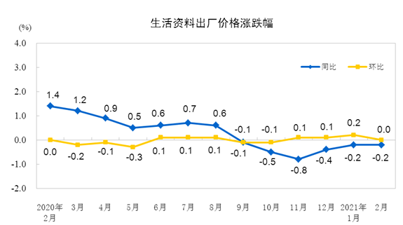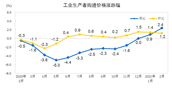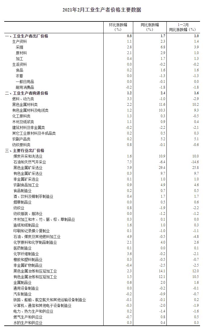 2021年2月份,全国工业生产者出厂价格同比上涨1.7%,环比上涨0.8%;工业生产者购进价格同比上涨2.4%,环比上涨1.2%。1—2月平均,工业生产者出厂价格比去年同期上涨1.0%,工业生产者购进价格上涨1.6%。