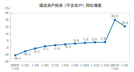 2021年1—3月份全国固定资产投资(不含农户)增长25.6% 比2019年1—3月份增长6.0%